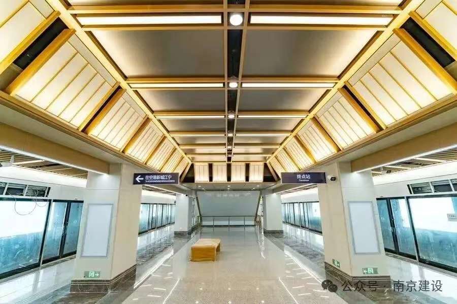 栖霞山站、金陵石化站等站点颇具特色。栖霞山站以“鎏金书卷”为设计灵感,通过仰角的装饰铝板搭配琥珀色LED线条灯,结合枫叶艺术装置与仿古红墙元素,呼应栖霞山特色;金陵石化站以工业记忆为核心,将彩色管道艺术化重构,打造南京首座工业风主题车站。