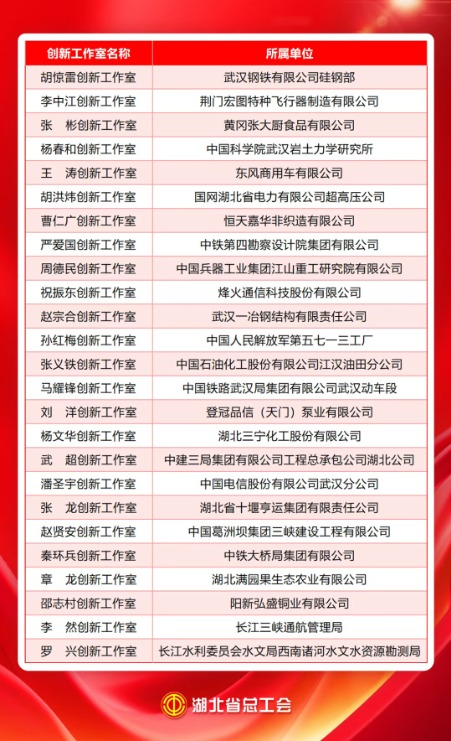 近日,湖北省总工会公布了2025年湖北省劳模工匠创新工作室(以下简称省级创新工作室)名单。经基层单位申报、各市级(大企、产业)工会初审推荐、专家评审、社会公示等程序,共有50家工作室新晋为省级创新工作室。