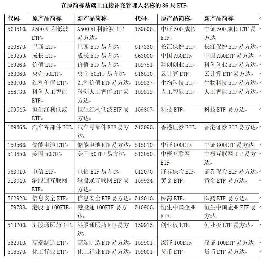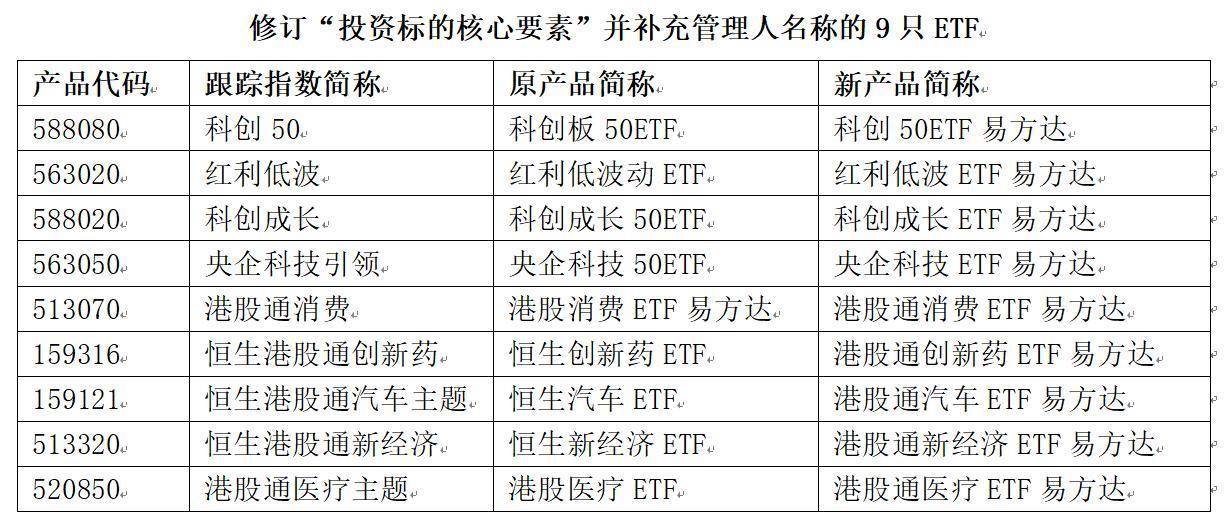 从本次45只ETF的调整细节来看,除直接在原简称后补充管理人名称外,有9只产品还同步修订了“投资标的核心要素”,进一步提升简称直观性。例如,对于通过港股通机制投资港股的行业主题ETF,在简称中加入“港股通”字样,如将跟踪恒生港股通创新药指数的“恒生创新药ETF”调整为“港股通创新药ETF易方达”;去掉冗余汉字或数字,如将跟踪科创50指数的“科创板50ETF”调整为“科创50ETF易方达”,将跟踪科创成长指数的“科创成长50ETF”更名为“科创成长ETF易方达”。
