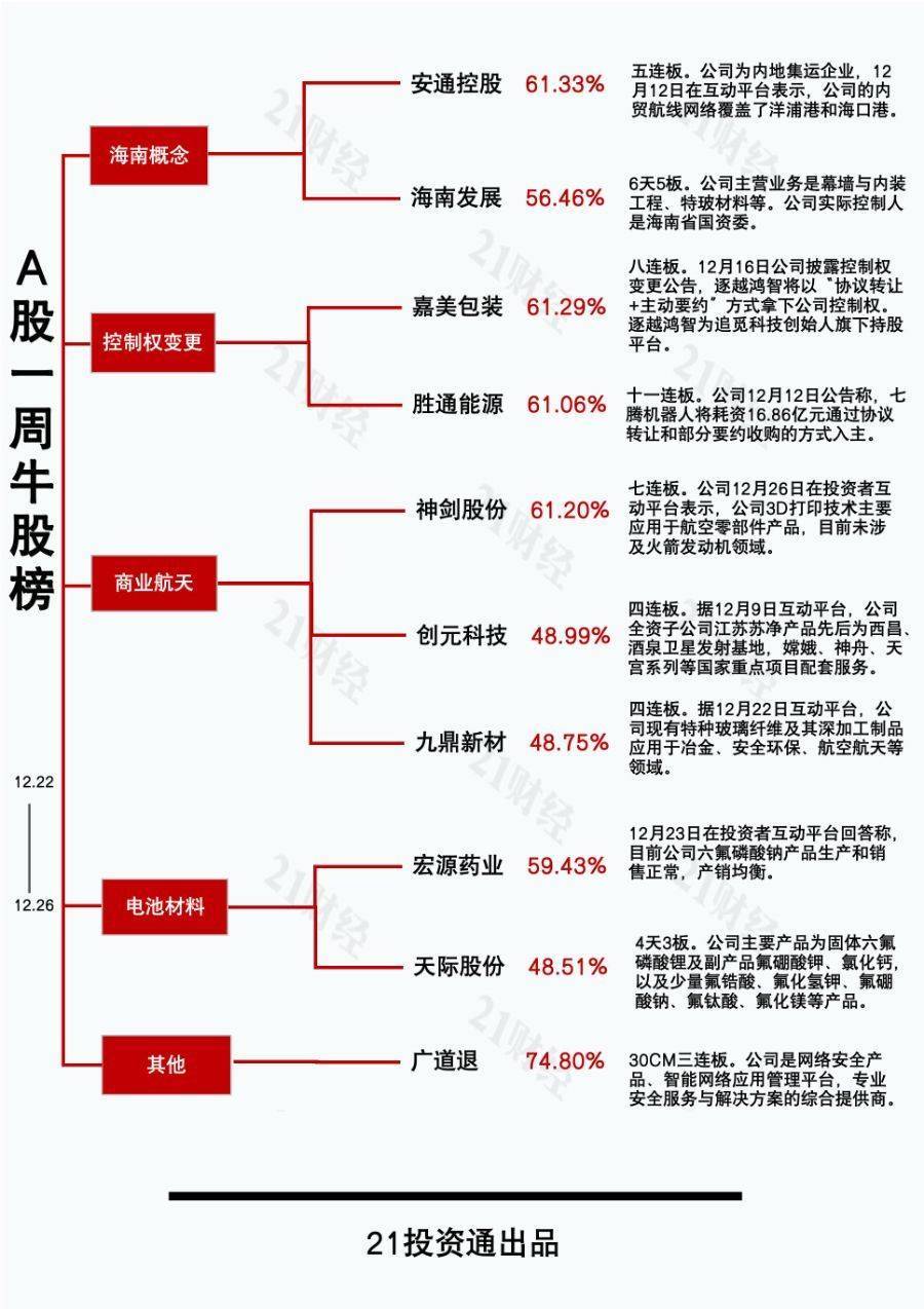 预计月底终止上市,最牛股广道退本周30CM三连板本期牛股榜中,广道退(920680.BJ)以74.80%的周涨幅夺魁,安通控股(600179.SH)以61.33%的涨幅位居第二,嘉美包装(002969.SZ)、神剑股份(002361.SZ)等三只个股周涨幅均超60%。本期牛股榜十只个股过去一周累计涨幅均超过48%。值得关注的是,本周牛股榜中包含近期多个热门概念股,如商业航天、海南概念等。