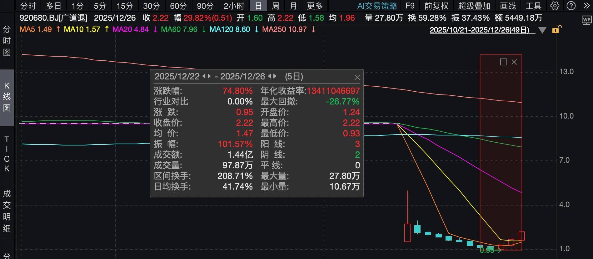 作为公司保荐机构及主承销商,五矿证券12月10日声明,拟于近期发布先行赔付专项基金设立的正式公告,对因广道数字虚假陈述受到损失的适格投资者进行先行赔付。目前,公司股票已于2025年12月11日进入退市整理期,退市整理期为15个交易日,预计最后交易日为2025年12月31日。退市整理期届满的次一交易日,北京证券交易所将对公司股票予以摘牌,公司股票终止上市。值得注意的是,公司股票近期被监管列为重点监控对象。例如,2025年12月15日至12月19日,北交所继续将退市整理股票“广道退”等列为重点监控股票,加强交易风险提示;其中对“广道退”上的异常交易行为采取自律监管措施18人次。